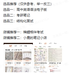选品一:高中英语语法电子版选品二:考研笔记选品三:结构化面试店铺推荐一:锦鲤相伴考试店铺推荐二:小鹿的笔记小店