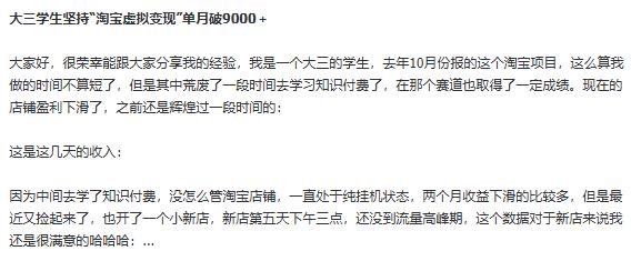 大三学生坚持“淘宝虚拟变现”单月破9000+大家好,很荣幸能跟大家分享我的经验,我是一个大三的学生,去年10月份报的这个淘宝项目,这么算我做的时间不算短了,但是...
