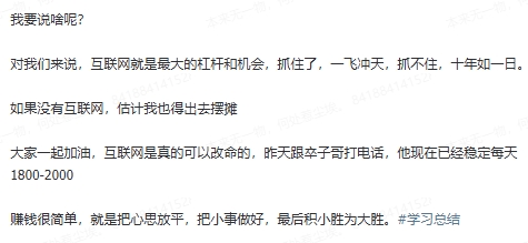 我要说啥呢?对我们来说,互联网就是最大的杠杆和机会,抓住了,一飞冲天,抓不住,十年如一日。如果没有互联网,估计我也得出去摆摊大家一起加油,互联网是真的可以改命的...