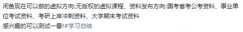 闲鱼现在可以做的虚拟方向:无版权的虚拟课程、资料发布方向:国考省考公考资料、事业单位考试资料、考研上岸冲刺资料、大学期末考试资料感兴趣的可以测试一番!